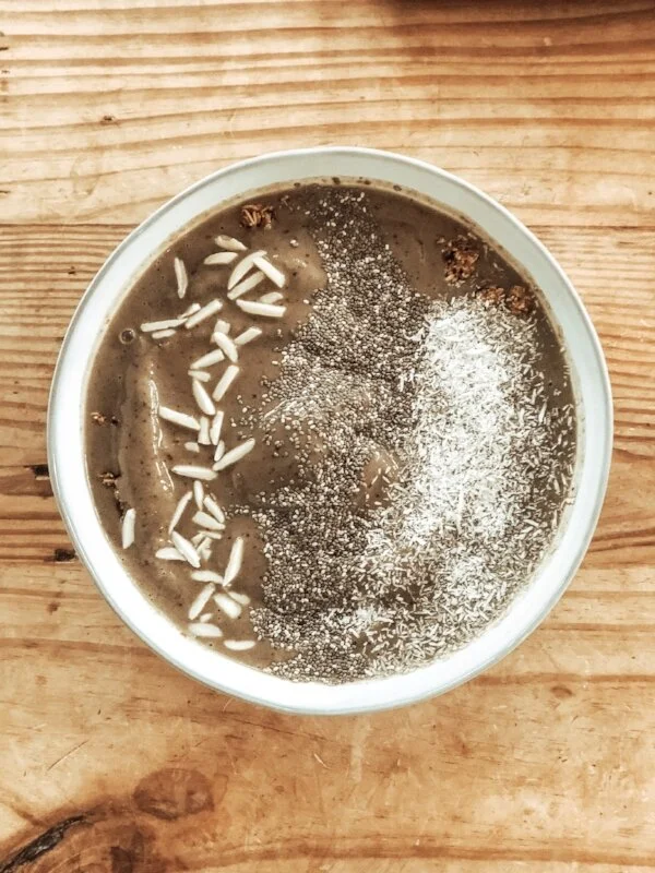 Top items such as cacao nibs, peanut/almond butter, chopped nuts, chia seeds or unsweetened coconut